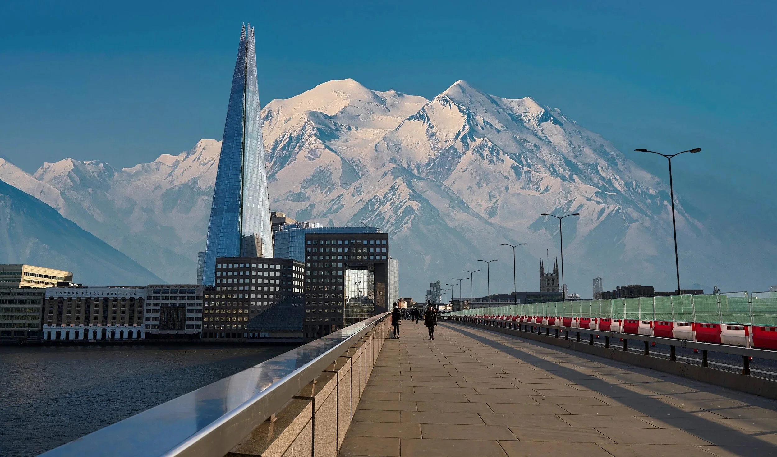 That became the project. Over the following weeks I combed through my lockdown archive — long walks on empty streets, golden hour light with nobody in it — and started pairing London locations with mountains from my travels and from Unsplash. Carnaby Street with the ski slopes of Andorra. St Paul's at golden hour with the mountains of Innsbruck. Tower Bridge with an alpine ridge.
