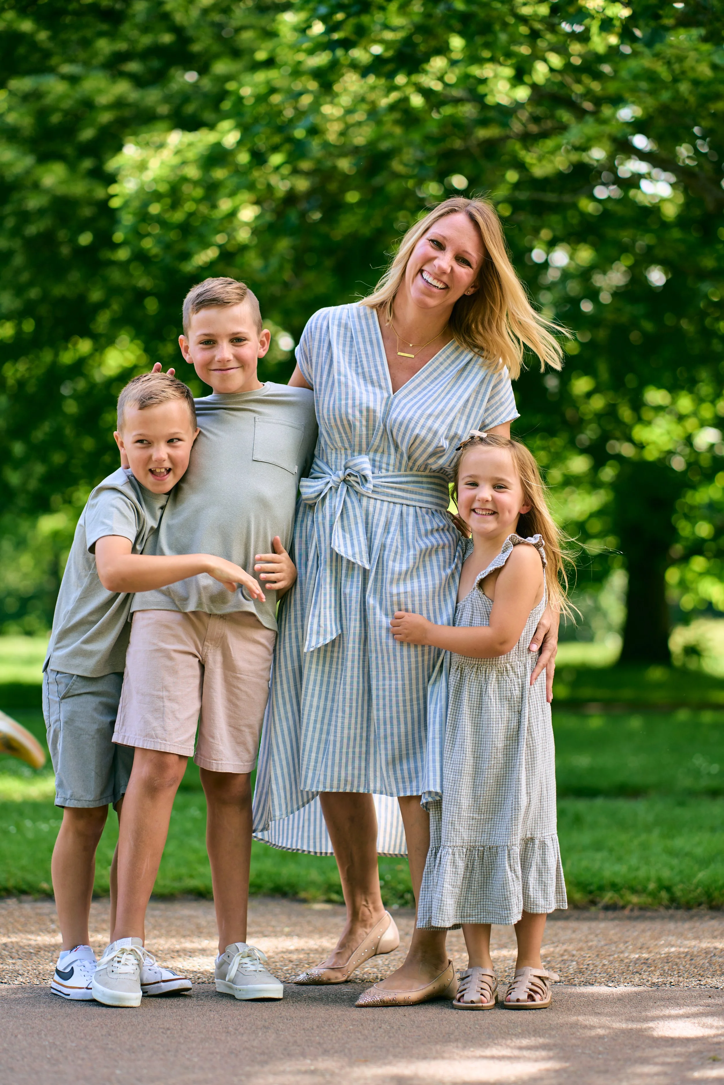 Coordinate, don't match For couples and families the goal is harmony, not uniformity. Choose a palette of two or three tones and dress within it rather than wearing identical outfits. One person in navy, another in cream and soft blue feels considered and relaxed. Everyone in the same shade of grey feels like a school photo. Layers help enormously here. A jacket you can take on and off, a scarf that adds texture. These small things create variety and movement within a single shoot. What to avoid: large logos, busy patterns, and anything you're not comfortable in. If you're not comfortable in what you're wearing, it will come through in the photos. Very bright white can also blow out in direct sunlight, which is worth knowing if you're shooting on a clear day.